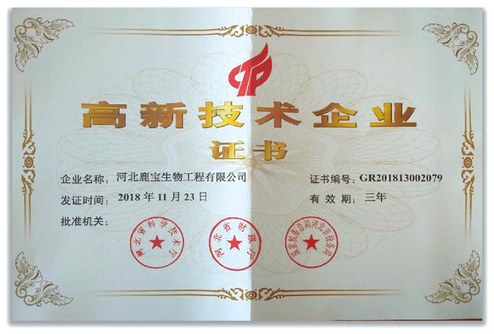 經(jīng)省科委審評(píng),河北鹿寶生物工程有限公司成為國家高新技術(shù)企業(yè)。